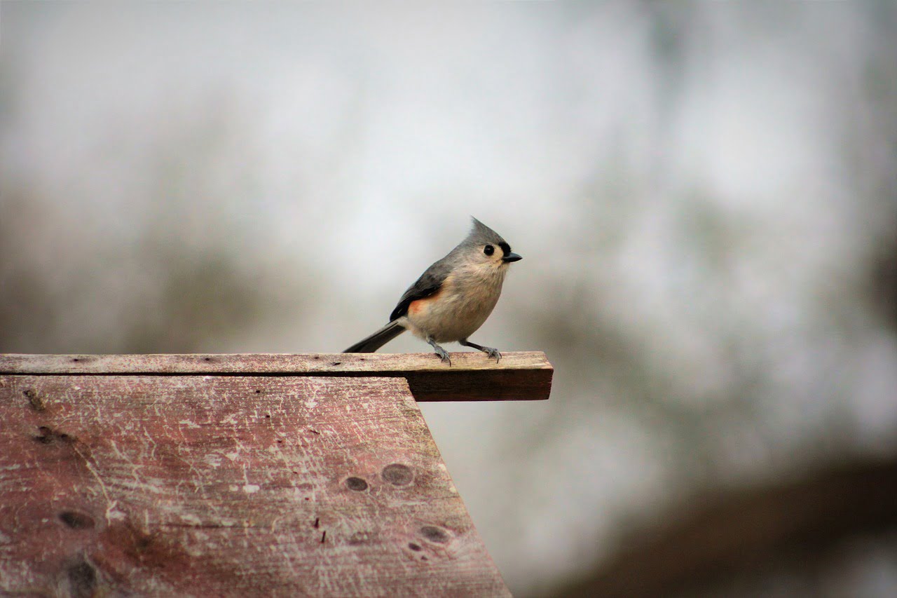 The Tufted Titmouse (Baeolophus bicolor) is a small, gray bird with a distinctive tuft of feathers on its head. These birds are common throughout North Carolina and can often be heard singing their clear, whistling songs in wooded areas.